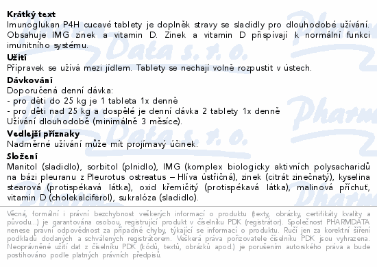 Imunoglukan P4H cucavé tablety je doplněk stravy se sladidly pro dlouhodobé užívání. Obsahuje IMG zinek a vitamin D. Zinek a vitamin D přispívají k normální funkci imunitního systému.