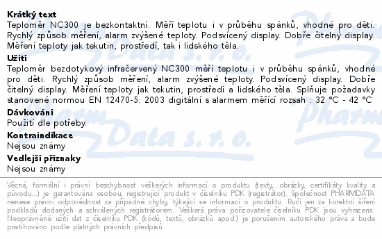 Teploměr NC300 je bezkontaktní. Měří teplotu i v průběhu spánků, vhodné pro děti. Rychlý způsob měření, alarm zvýšené teploty. Podsvícený display. Dobře čitelný display. Měření teploty jak tekutin, prostředí, tak i lidského těla.