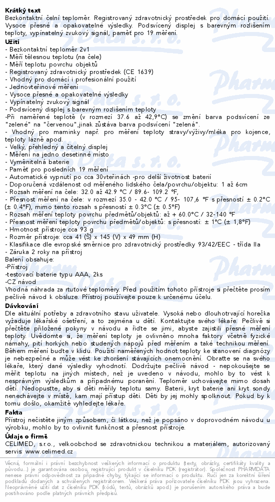 Bezkontaktní čelní teploměr. Registrovaný zdravotnický prostředek zejména pro domácí použití . Vysoce přesné a opakovatelné výsledky. Podsvícený displej s barevným rozlišením teploty, vypínatelný zvukový signál, paměť pro 19 měření.