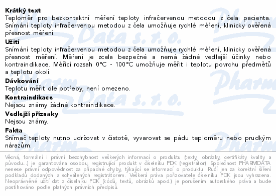 Teploměr pro bezkontaktní měření teploty infračervenou metodou z čela pacienta. Snímání teploty infračervenou metodou z čela umožňuje rychlé měření, klinicky ověřená přesnost měření.