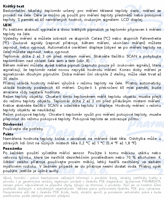 Bezkontaktní lékařský teploměr určený pro měření tělesné teploty osob, měření se provádí na čele. Dále je možno jej použít pro měření teploty předmětů nebo pokojové teploty. S pamětí až 60 naměřených hodnot, zvukovým signálem. LCD displej.