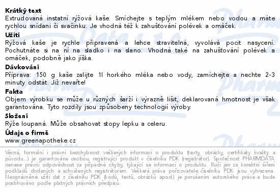 Extrudovaná instatní rýžová kaše. Smíchejte s teplým mlékem nebo vodou a máte rychlou snídani či svačinku. Je vhodná též k zahušťování polévek a omáček.