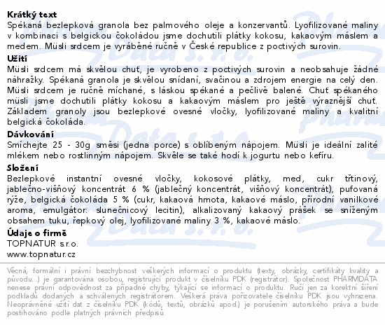 Spékaná bezlepková granola bez palmového oleje a konzervantů. Lyofilizované maliny v kombinaci s belgickou čokoládou jsme dochutili plátky kokosu, kakaovým máslem a medem. Müsli srdcem je vyráběné ručně v České republice z poctivých surovin.