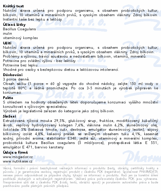 Nutriční strava určená pro podporu organismu, s obsahem probiotických kultur, bílkovin, 10 vitamínů a minerálních prvků, s vysokým obsahem vlákniny. Zdroj bílkovin. Instantní kaše bez lepku a laktózy.