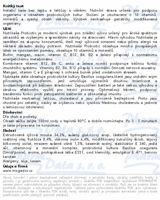 Instatní kaše bez lepku a laktózy s višněmi. Nutriční strava určená pro podporu organismu s obsahem probiotických kultur. Složení je obohaceno o 10 vitamínů, minerálů a vysoký obsah vlákniny. Výrobek neobsahuje geneticky modifikované organismy.