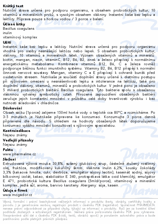 Nutriční strava určená pro podporu organismu, s obsahem probiotických kultur, 10 vitamínů a minerálních prvků, s vysokým obsahem vlákniny. Instantní kaše bez lepku a laktózy. Příprava pouze s horkou vodou / 3 porce v balení.