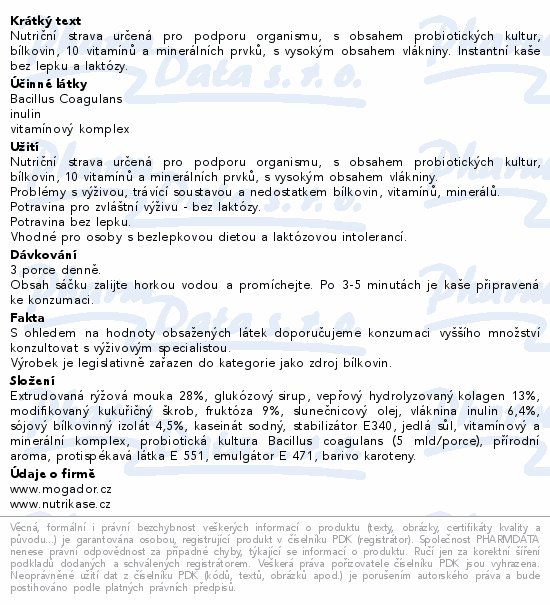 Nutriční strava určená pro podporu organismu, s obsahem probiotických kultur, bílkovin, 10 vitamínů a minerálních prvků, s vysokým obsahem vlákniny. Instantní kaše bez lepku a laktózy. Příprava pouze s horkou vodou / 3 porce v balení.