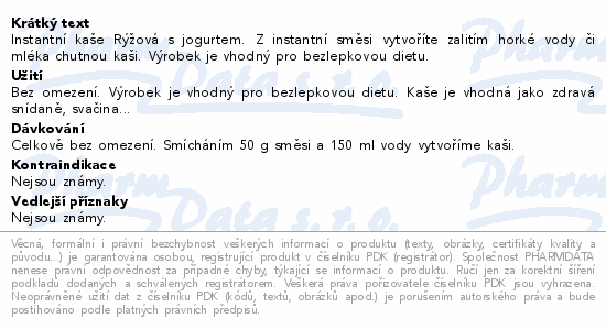 Instantní kaše Rýžová s jogurtem. Z instantní směsi vytvoříte zalitím horké vody či mléka chutnou kaši. Výrobek je vhodný pro bezlepkovou dietu.