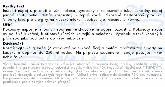 Instantí nápoj s příchutí a vůní kokosu, vyrobený z kokosového tuku. Lahodný nápoj jemné chuti, velmi dobře rozpustný v teplé vodě. Přirozeně bezlepkový produkt. Vhodný také pro alergiky na kravské mléko. Neobsahuje mléčnou bílkovinu.