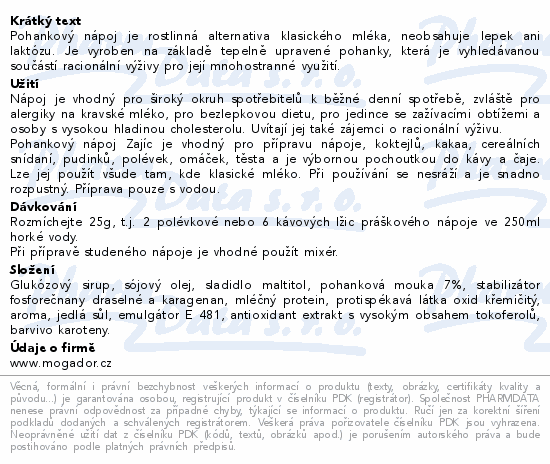 Pohankový nápoj je rostlinná alternativa klasického mléka, neobsahuje lepek ani laktózu. Je vyroben na základě tepelně upravené pohanky, která je vyhledávanou součástí racionální výživy pro její mnohostranné využití.
