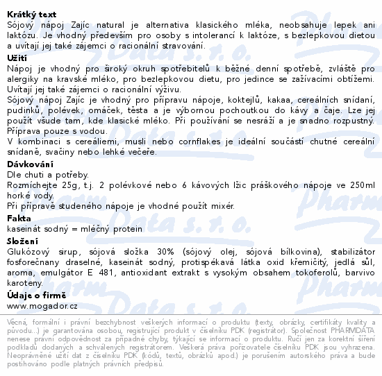 Sójový nápoj Zajíc natural je rostlinná alternativa klasického mléka, neobsahuje lepek ani laktózu. Je vhodný především pro osoby s intolerancí k laktóze, s bezlepkovou dietou a uvítají jej také zájemci o racionální stravování.