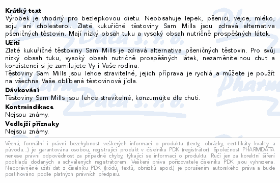 Výrobek je vhodný pro bezlepkovou dietu. Neobsahuje lepek, pšenici, vejce, mléko, soju ani cholesterol. Zlaté kukuřičné těstoviny Sam Mills jsou zdravá alternativa pšeničných těstovin. Mají nízký obsah tuku a vysoký obsah nutričně prospěšných látek.