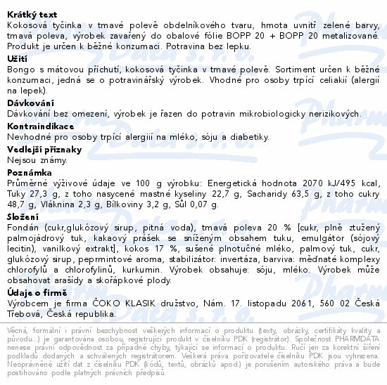 Kokosová tyčinka v tmavé polevě obdelníkového tvaru, hmota uvnitř zelené barvy, tmavá poleva, výrobek zavařený do obalové fólie BOPP 20 + BOPP 20 metalizované. Produkt je určen k běžné konzumaci. Potravina bez lepku.