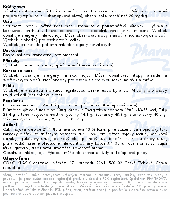 Tyčinka s kokosovou příchutí v tmavé polevě. Potravina bez lepku. Výrobek je vhodný pro osoby trpící celiakií (bezlepková dieta), obsah lepku menší než 20 mg/kg.