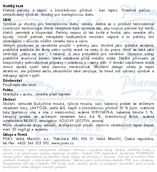 Křehké peřinky s náplní s čokoládovou příchutí - bez lepku. Trvanlivé pečivo - extrudovaný výrobek, vhodný pro bezlepkovou dietu.