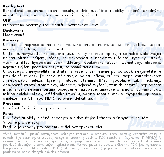 Bezlepková potravina, balení obsahuje dvě kukuřičné trubičky plněné lahodným, nízkotučným krémem s čokoládovou příchutí, váha 18g.