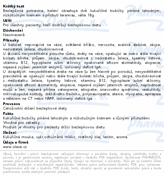 Bezlepková potravina, balení obsahuje dvě kukuřičné trubičky plněné lahodným, nízkotučným krémem s příchutí teramisu, váha 18g.