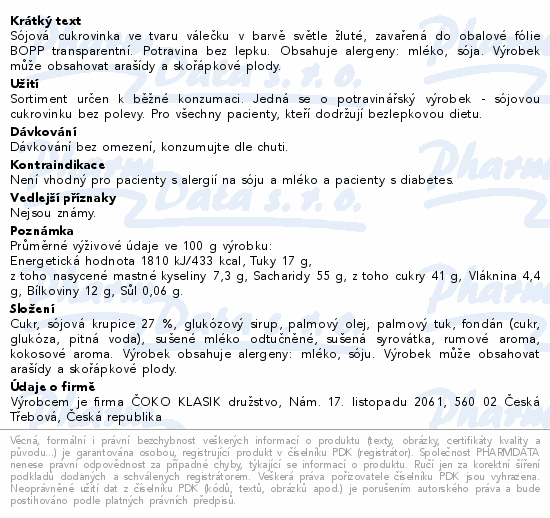 Sójová cukrovinka ve tvaru válečku v barvě světle žluté, zavařená do obalové fólie BOPP transparentní. Potravina bez lepku. Obsahuje alergeny: mléko, sója. Výrobek může obsahovat arašídy a skořápkové plody.