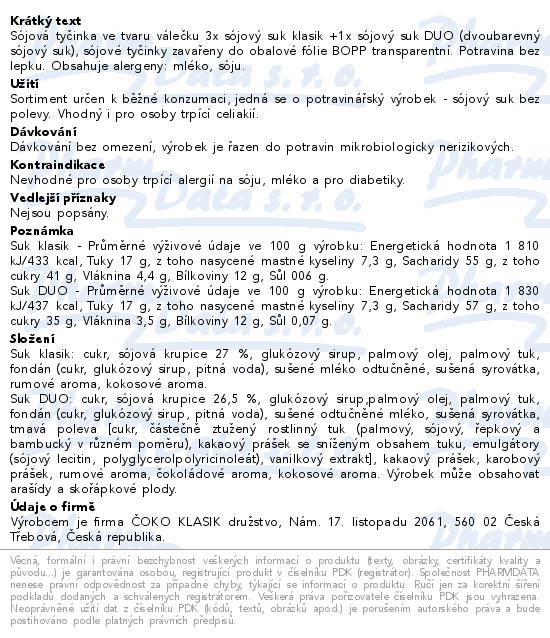 Sójová tyčinka ve tvaru válečku 3x sójový suk klasik +1x sójový suk DUO (dvoubarevný sójový suk), sójové tyčinky zavařeny do obalové fólie BOPP transparentní. Potravina bez lepku. Obsahuje alergeny: mléko, sóju.