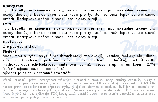 Tyto bagetky se sušenými rajčaty, bazalkou a česnekem jsou speciálně určeny pro osoby dodržující bezlepkovou dietu nebo pro ty, kteří se snaží lepek ve své stravě omezit. Bezlepkové pečivo je navíc i bez laktózy a sóji.