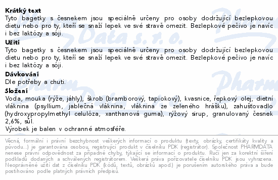 Tyto bagetky s česnekem jsou speciálně určeny pro osoby dodržující bezlepkovou dietu nebo pro ty, kteří se snaží lepek ve své stravě omezit. Bezlepkové pečivo je navíc i bez laktózy a sóji.