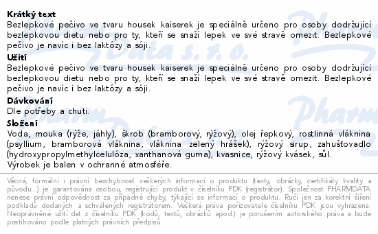 Bezlepkové pečivo ve tvaru housek kaiserek je speciálně určeno pro osoby dodržující bezlepkovou dietu nebo pro ty, kteří se snaží lepek ve své stravě omezit. Bezlepkové pečivo je navíc i bez laktózy a sóji.