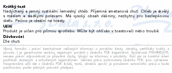 Nadýchaný a jemný rustikální řemeslný chléb. Příjemná smetanová chuť. Chléb je skvělý s máslem a sladkými polevami. Má vysoký obsah vlákniny, nezbytný pro bezlepkovou dietu. Pečivo je ideální na toasty.
