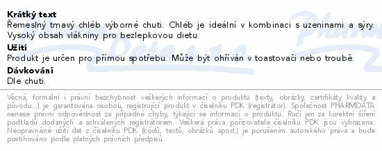 Řemeslný tmavý chléb výborné chuti. Chléb je ideální v kombinaci s uzeninami a sýry. Vysoký obsah vlákniny pro bezlepkovou dietu.