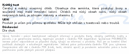 Čerstvý a měkký vícezrnný chléb. Obsahuje chia semínka, která poskytují živiny a současně mají malé množství kalorií. Chlebík má nízký obsah cukru, nízký obsah nasycených tuků, je zdrojem vlákniny a vitamínu E.