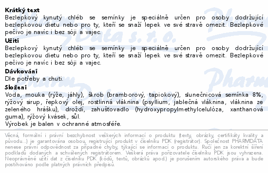 Bezlepkový kynutý chléb se semínky je speciálně určen pro osoby dodržující bezlepkovou dietu nebo pro ty, kteří se snaží lepek ve své stravě omezit. Bezlepkové pečivo je navíc i bez sóji a vajec.
