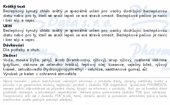 Bezlepkový kynutý chléb světlý je speciálně určen pro osoby dodržující bezlepkovou dietu nebo pro ty, kteří se snaží lepek ve své stravě omezit. Bezlepkové pečivo je navíc i bez sóji a vajec.