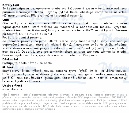 Směs pro přípravu bezlepkového chleba pro každodenní stravu – tentokráte opět pro příznivce zrníčkových chlebů - dýňový (tykev). Balení obsahuje kromě směsi na chléb též instantní droždí. Příprava možná i v domácí pekárně.