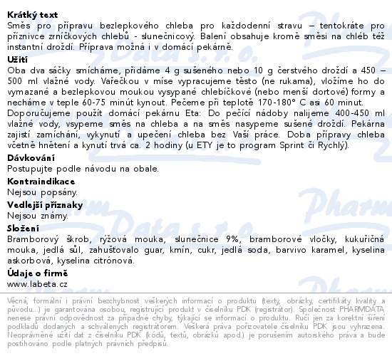 Směs pro přípravu bezlepkového chleba pro každodenní stravu – tentokráte pro příznivce zrníčkových chlebů - slunečnicový. Balení obsahuje kromě směsi na chléb též instantní droždí. Příprava možná i v domácí pekárně.