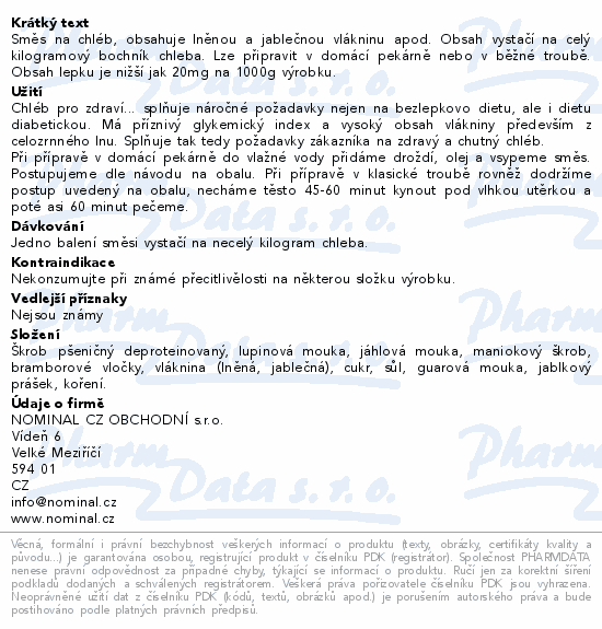 Směs na chléb, obsahuje lněnou a jablečnou vlákninu apod. Obsah vystačí na celý kilogramový bochník chleba. Lze připravit v domácí pekárně nebo v běžné troubě. Obsah lepku je nižší jak 20mg na 1000g výrobku.