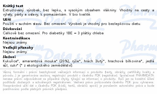 Extrudovaný výrobek, bez lepku, s vysokým obsahem vlákniny. Vhodný na cesty a výlety, párty a oslavy, k pomazánkám. V bio kvalitě.