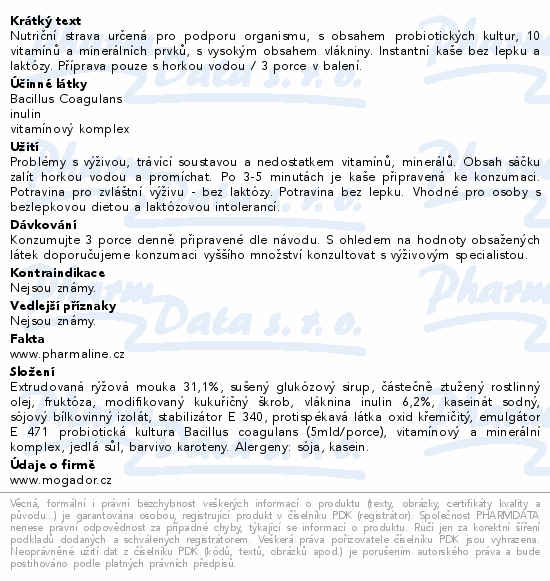Nutriční strava určená pro podporu organismu, s obsahem probiotických kultur, 10 vitamínů a minerálních prvků, s vysokým obsahem vlákniny. Instantní kaše bez lepku a laktózy. Příprava pouze s horkou vodou / 3 porce v balení.