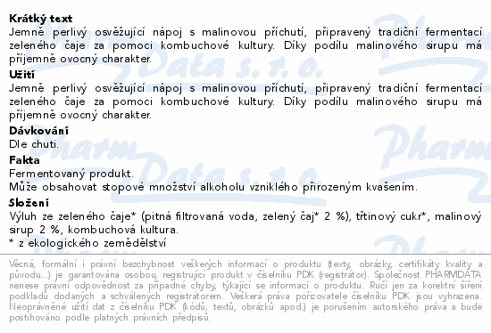 Jemně perlivý osvěžující nápoj s malinovou příchutí, připravený tradiční fermentací zeleného čaje za pomoci kombuchové kultury. Díky podílu malinového sirupu má příjemně ovocný charakter.