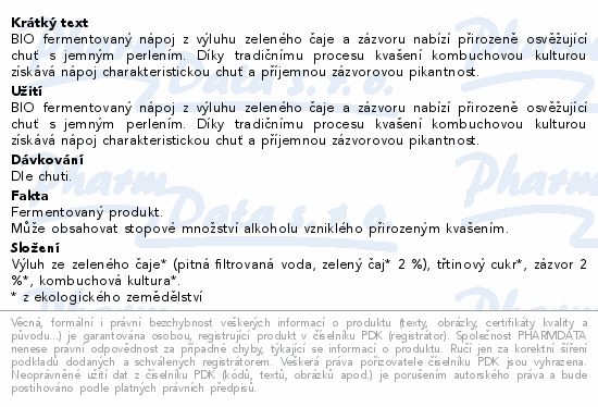 BIO fermentovaný nápoj z výluhu zeleného čaje a zázvoru nabízí přirozeně osvěžující chuť s jemným perlením. Díky tradičnímu procesu kvašení kombuchovou kulturou získává nápoj charakteristickou chuť a příjemnou zázvorovou pikantnost.
