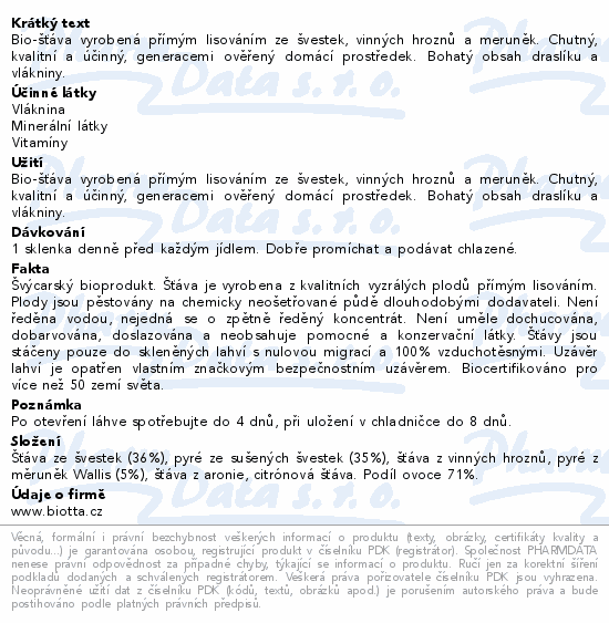 Bio-šťáva vyrobená přímým lisováním ze švestek, vinných hroznů a meruněk. Chutný, kvalitní a účinný, generacemi ověřený domácí prostředek. Bohatý obsah draslíku a vlákniny.