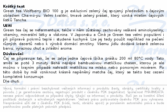 Green tea Wolfberry BIO 100 g je exkluzivní zelený čaj spojený především s čajovým obřadem Cha-no-yu. Velmi kvalitní, tmavě zelený prášek, který vzniká mletím čajových lístků Tencha.