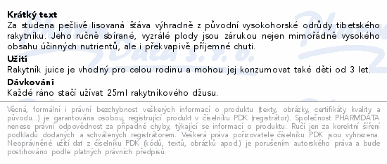 Za studena pečlivě lisovaná šťáva výhradně z původní vysokohorské odrůdy tibetského rakytníku. Jeho ručně sbírané, vyzrálé plody jsou zárukou nejen mimořádně vysokého obsahu účinných nutrientů, ale i překvapivě příjemné chuti.