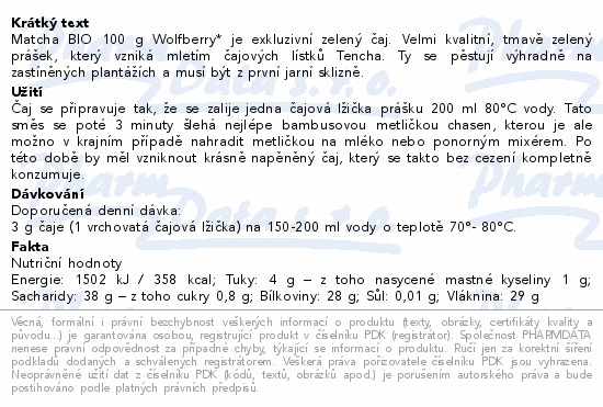 Matcha BIO 100 g Wolfberry* je exkluzivní zelený čaj. Velmi kvalitní, tmavě zelený prášek, který vzniká mletím čajových lístků Tencha. Ty se pěstují výhradně na zastíněných plantážích a musí být z první jarní sklizně.