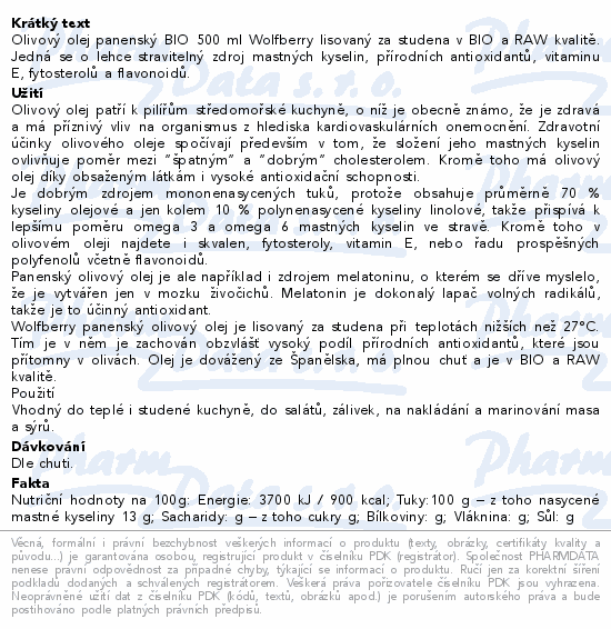 Olivový olej panenský BIO 500 ml Wolfberry lisovaný za studena v BIO a RAW kvalitě. Jedná se o lehce stravitelný zdroj mastných kyselin, přírodních antioxidantů, vitaminu E, fytosterolů a flavonoidů.