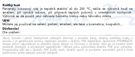 Panenský kokosový olej je tepelně stabilní až do 200 °C, takže se výborně hodí na smažení, při výrobě cukroví, při přípravě teplých pokrmů v orientálních kuchyních. Výborně se dá použít jako náhrada běžného krému nebo tělového mléka.