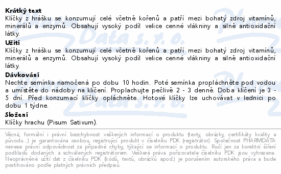 Klíčky z hrášku se konzumují celé včetně kořenů a patří mezi bohatý zdroj vitamínů, minerálů a enzymů. Obsahují vysoký podíl velice cenné vlákniny a silně antioxidační látky.