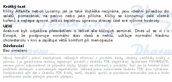Klíčky AlfaAlfa neboli Lucerny, jak je také Vojtěška nazývána, jsou ideální přísadou do salátů, pomazánek, na pečivo nebo jako příloha. Klíčky se konzumují celé včetně kořenů a nejlépe syrové, jelikož tepelnou úpravou ztrácejí část své výživné hodnoty.