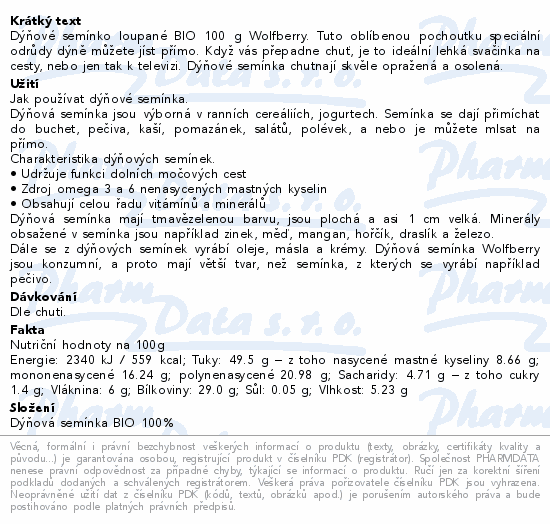 Dýňové semínko loupané BIO 100 g Wolfberry. Tuto oblíbenou pochoutku speciální odrůdy dýně můžete jíst přímo. Když vás přepadne chuť, je to ideální lehká svačinka na cesty, nebo jen tak k televizi. Dýňové semínka chutnají skvěle opražená a osolená.