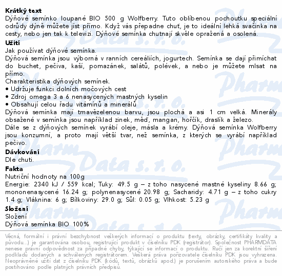 Dýňové semínko loupané BIO 500 g Wolfberry. Tuto oblíbenou pochoutku speciální odrůdy dýně můžete jíst přímo. Když vás přepadne chuť, je to ideální lehká svačinka na cesty, nebo jen tak k televizi. Dýňové semínka chutnají skvěle opražená a osolená.
