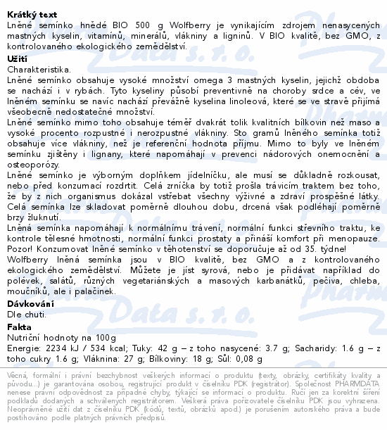 Lněné semínko hnědé BIO 500 g Wolfberry je vynikajícím zdrojem nenasycených mastných kyselin, vitamínů, minerálů, vlákniny a ligninů. V BIO kvalitě, bez GMO, z kontrolovaného ekologického zemědělství.
