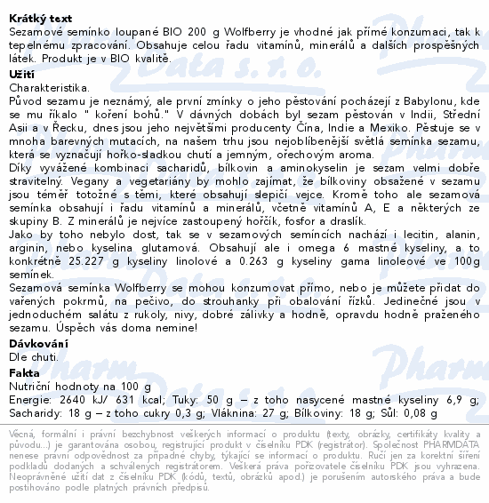 Sezamové semínko loupané BIO 200 g Wolfberry je vhodné jak přímé konzumaci, tak k tepelnému zpracování. Obsahuje celou řadu vitamínů, minerálů a dalších prospěšných látek. Produkt je v BIO kvalitě.